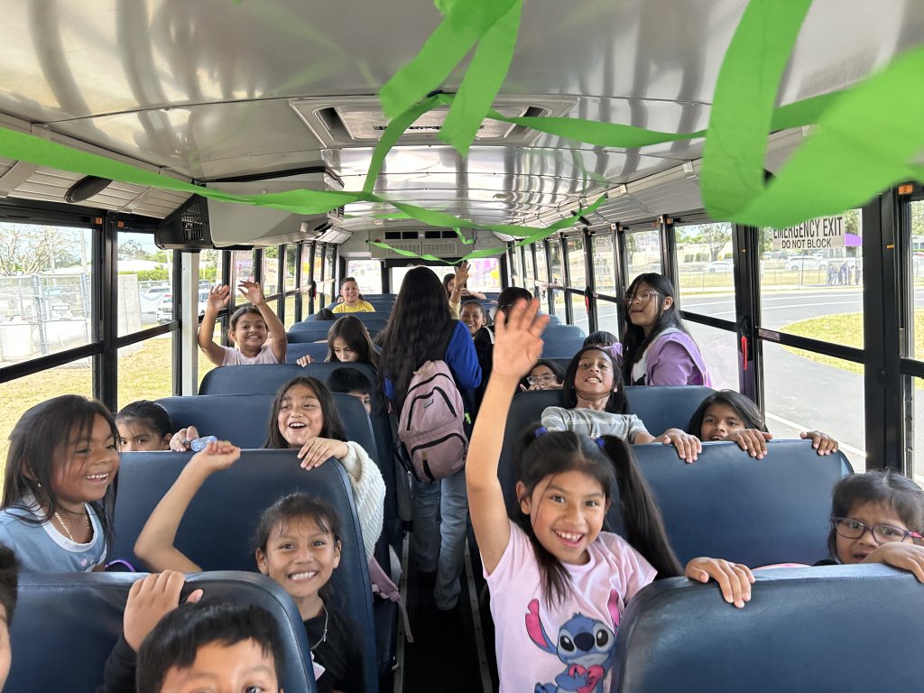Super Kids celebrate inside the new bus